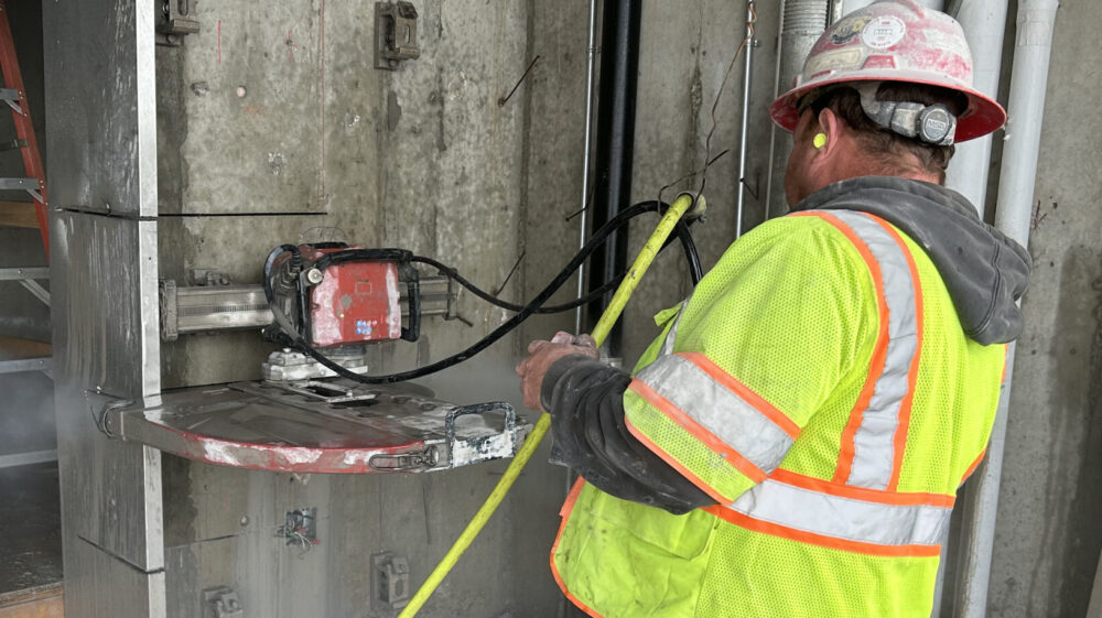 Vertical wall sawing through concrete walls has changed the character of building modifications. The dustless, vibration-free quality of wall sawing is rapidly making pneumatic breaking obsolete. Cutting openings in brick, block and concrete walls causes no structural damage and requires no patching. The convenience of sawing out and completely removing many openings in a day cannot be matched by any other method.